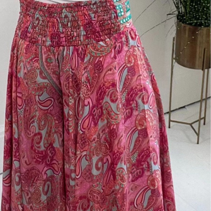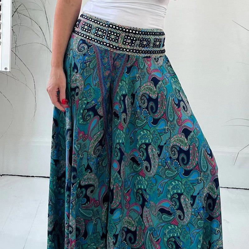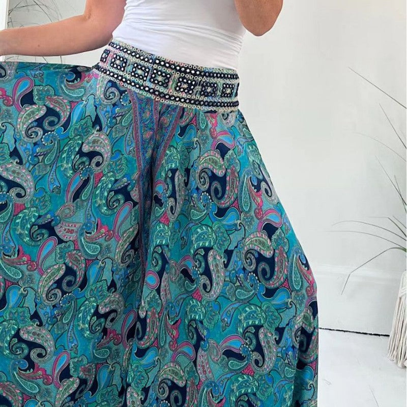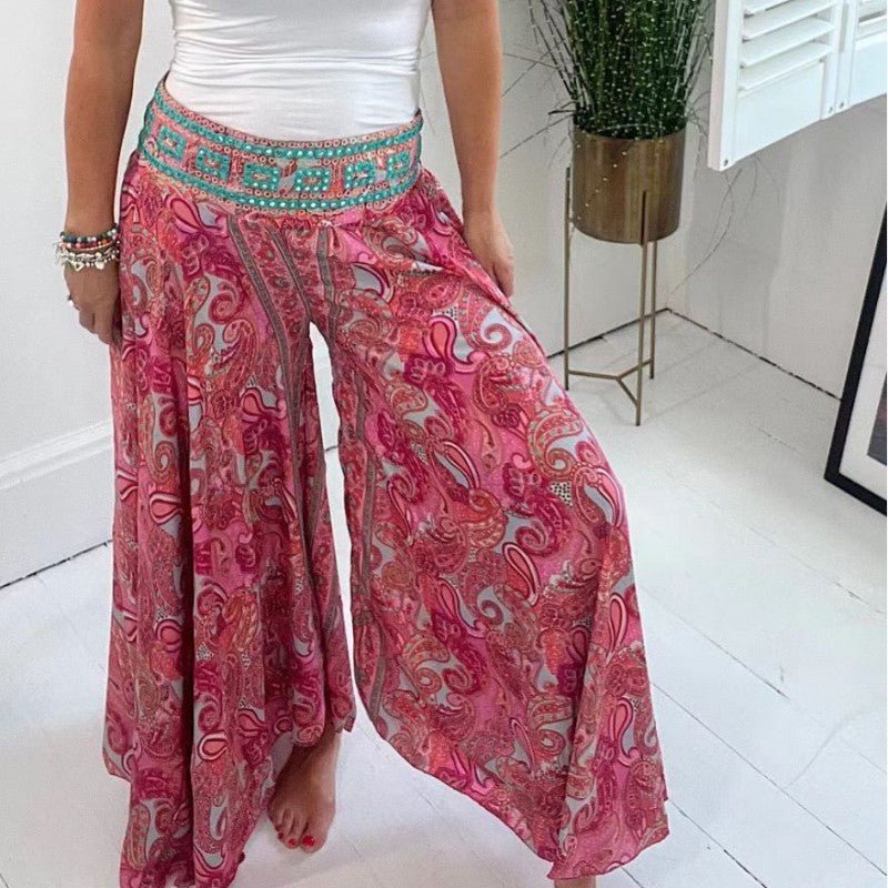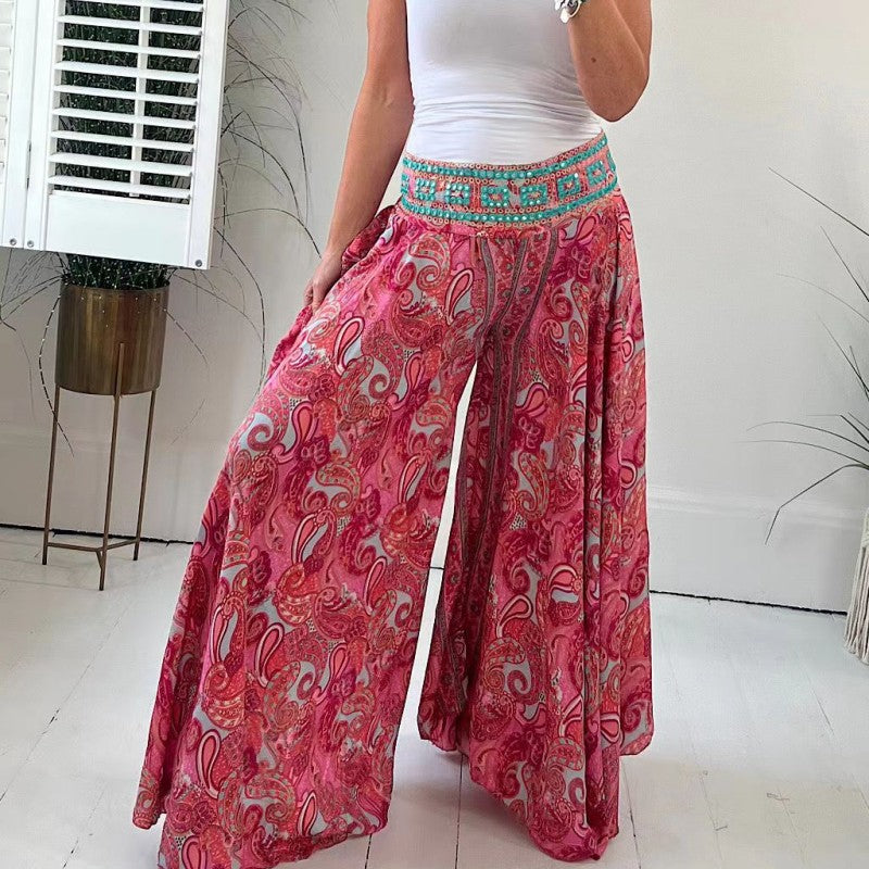 1* Ελαφρύ έθνικ παντελόνι με σχέδιο Paisley, ελαστική, patchwork ζώνη στη μέση