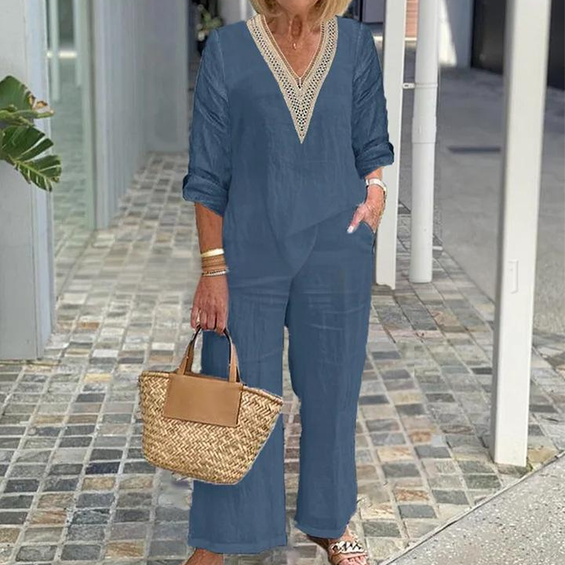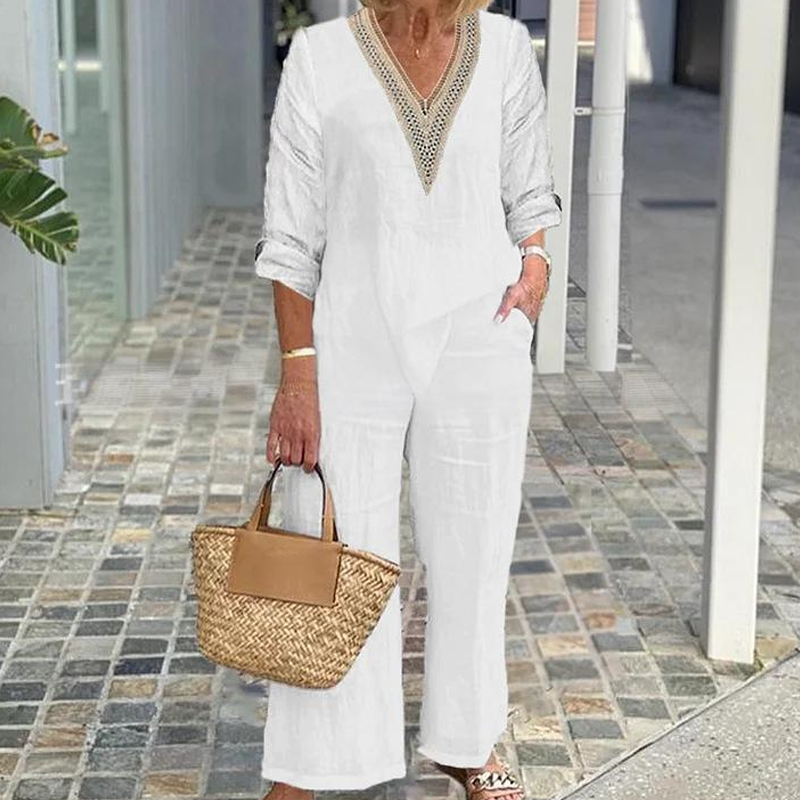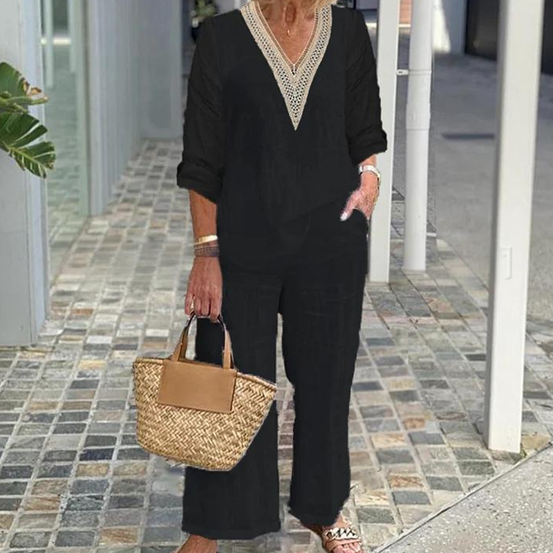 Το πακέτο περιλαμβάνει: 1* Γυναικείο μπλουζάκι με V λαιμόκοψη & παντελόνι με φαρδιά πόδια