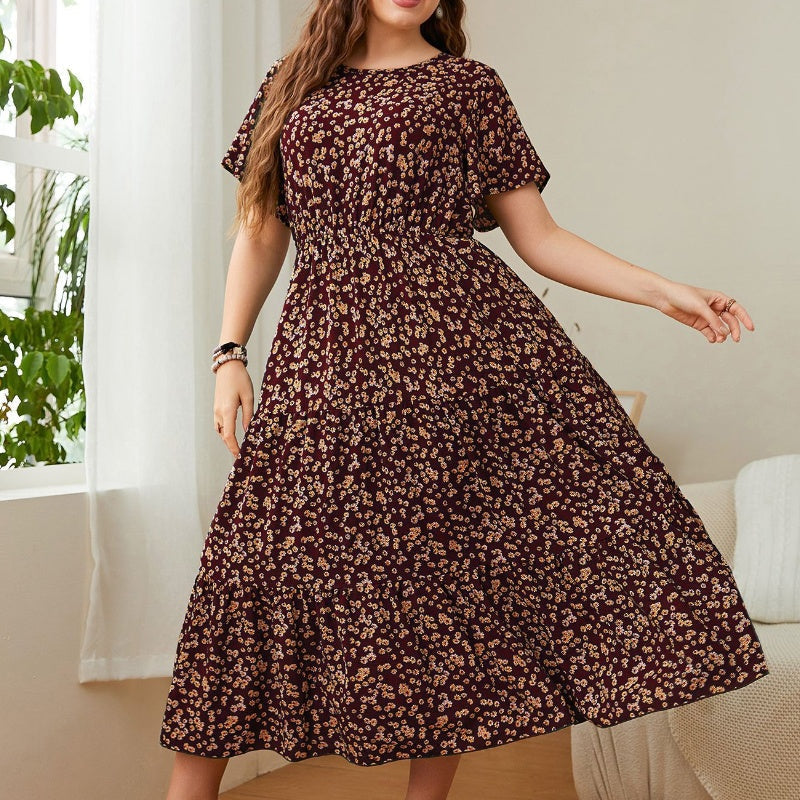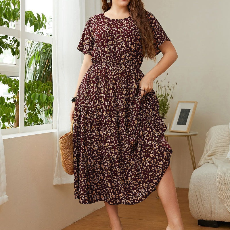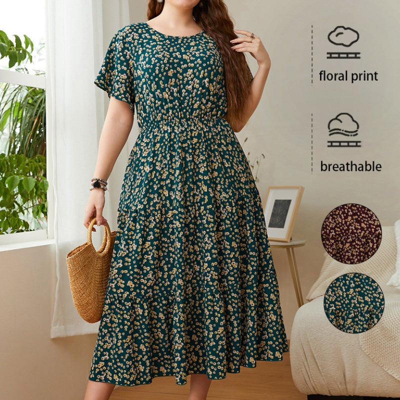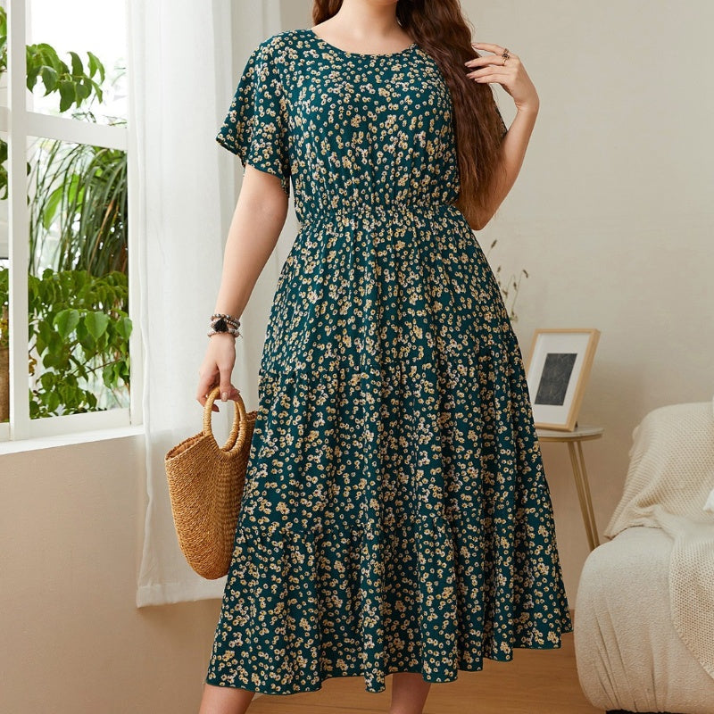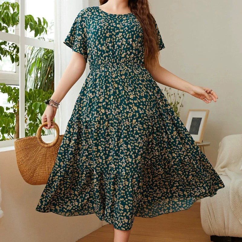 ✨Γυναικείο Φόρεμα με Στρογγυλό Λαιμό, Φυτικό Μοτίβο και Στενή Μέση