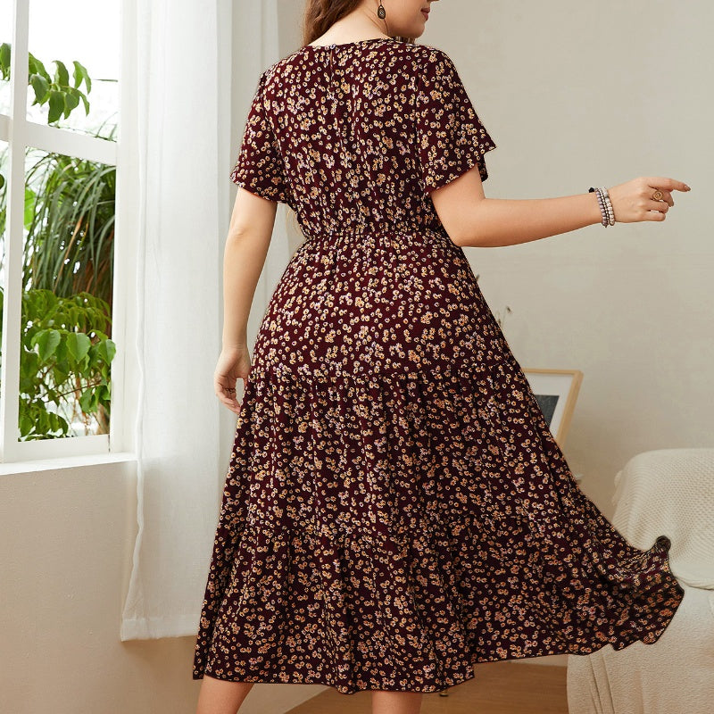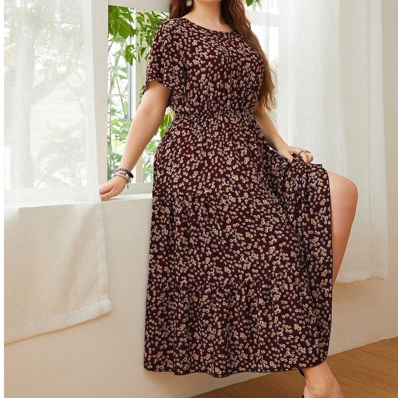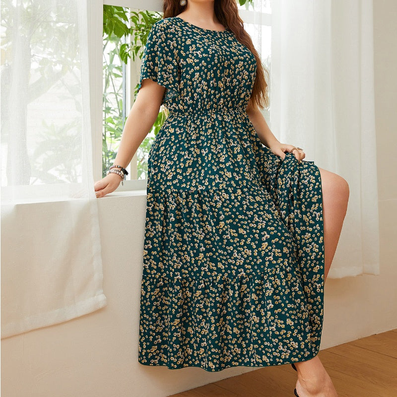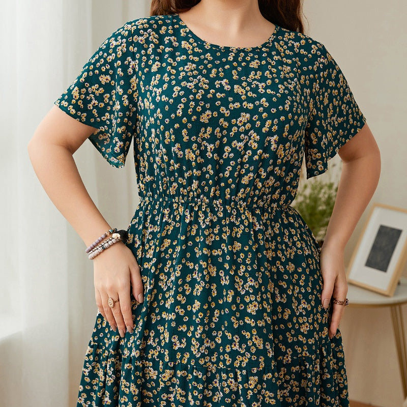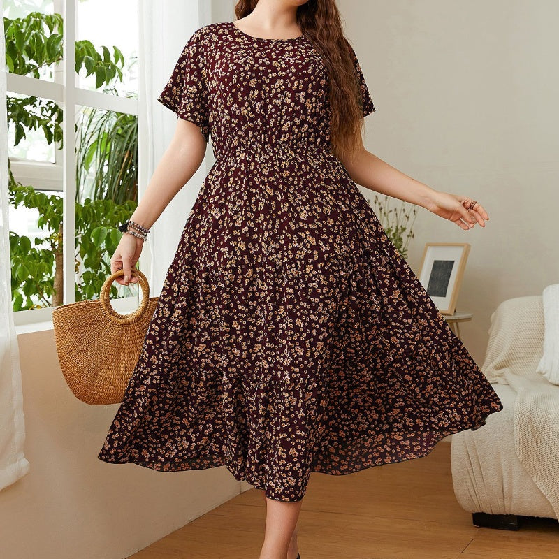 ✨Γυναικείο Φόρεμα με Στρογγυλό Λαιμό, Φυτικό Μοτίβο και Στενή Μέση