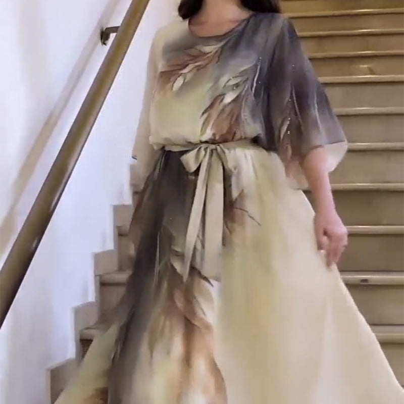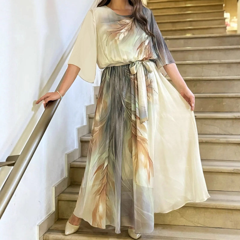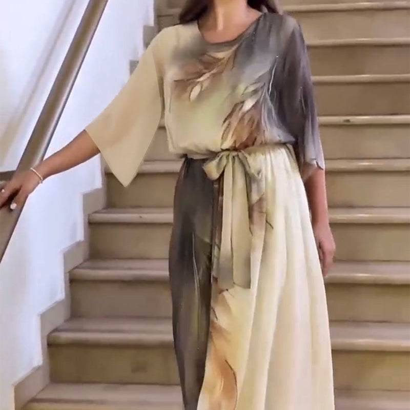 Αυτό το μακρύ φόρεμα με στρογγυλό λαιμό έχει αέρινη γραμμή και μοναδικό ακανόνιστο τύπωμα, που του προσδίδει κομψότητα τόσο σε casual όσο και σε επίσημες περιστάσεις. Το ελαφρύ ύφασμα εξασφαλίζει άνεση και στυλ όλη την ημέρα.