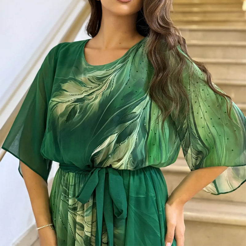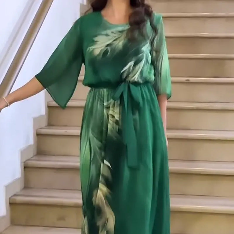 Με στρογγυλό λαιμό που κολακεύει τη σιλουέτα, μοντέρνα φαρδιά μανίκια και ζώνη που σφίγγει τη μέση, αυτό το φόρεμα συνδυάζει τέλεια την κλασική κομψότητα με τη σύγχρονη μόδα. Είναι ιδανικό για να το συνδυάσετε με αξεσουάρ και να δημιουργήσετε ένα μοντέρνο στυλ.