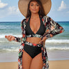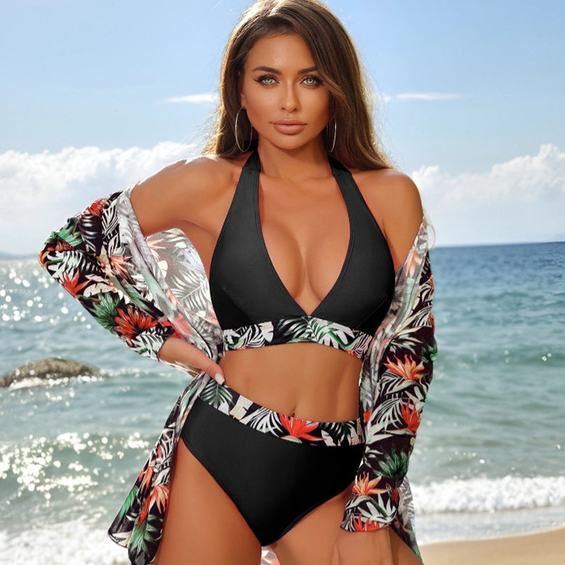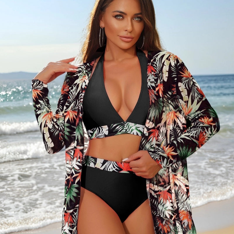 1 * Γυναικείο σετ μαγιό με τροπικό σχέδιο - κάλυμμα, μπικίνι μπλουζάκι και σλιπ