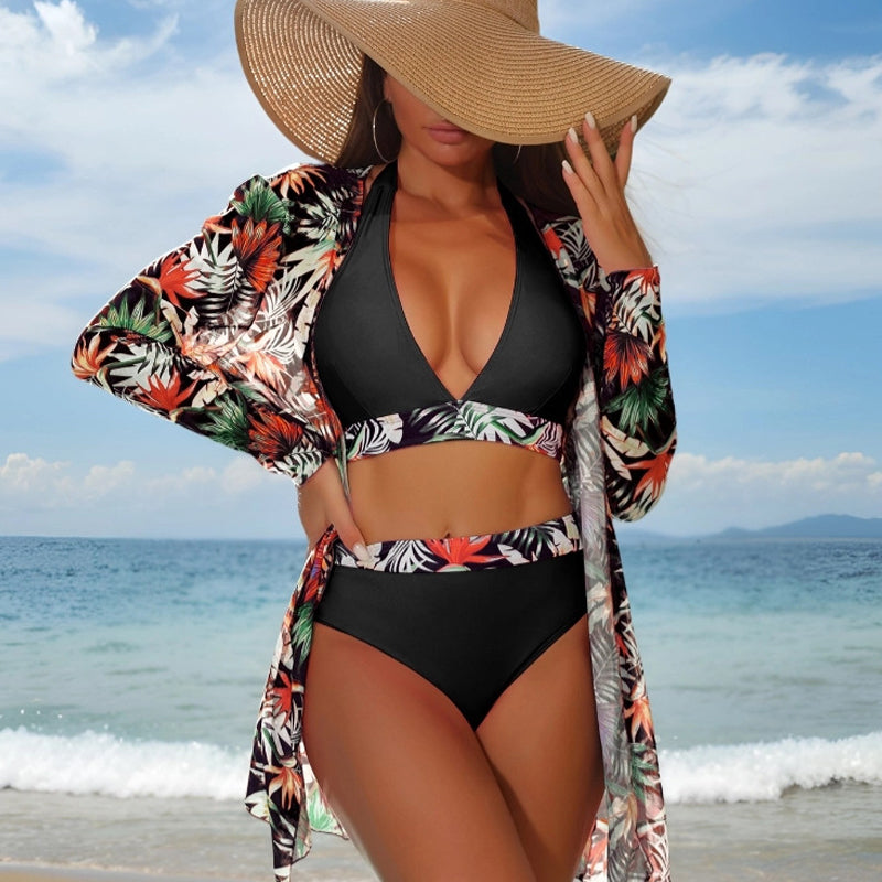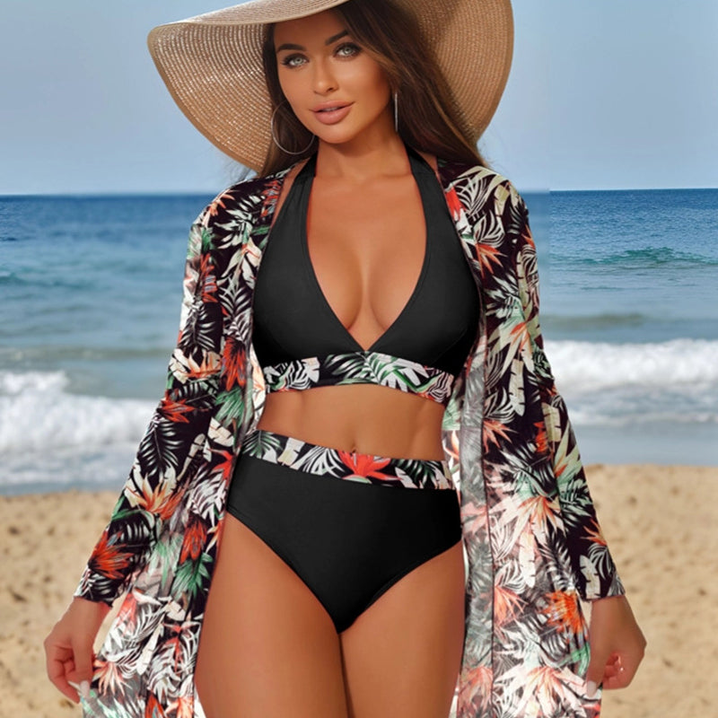 Βασικά είδη παραλίας 3 σε 1 - Αυτό το σετ με τροπικά σχέδια περιλαμβάνει ένα μπικίνι, ένα φλερτ σλιπ και ένα ελαφρύ ασορτί κάλυμμα.